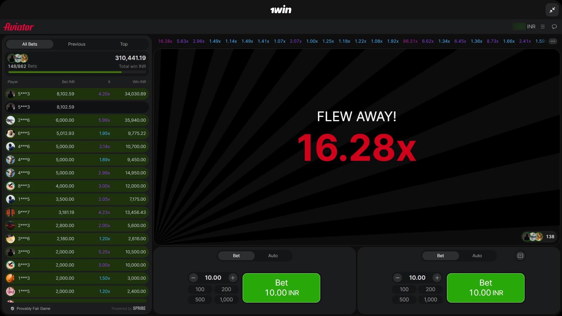 The maximum payout reaches ₹10,00,000 per round. Actual wins depend on your bet size and the multiplier when you cash out.